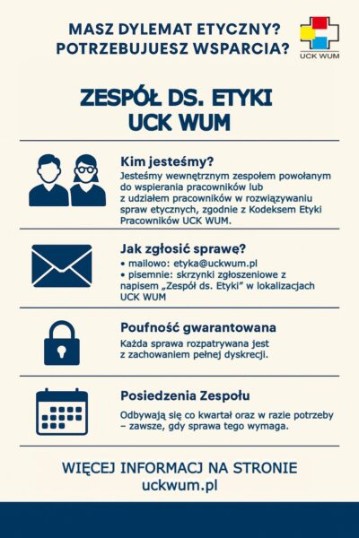 Zespół ds. Etyki został powołany w celu wspierania pracowników lub z udziałem pracowników w rozwiązywaniu spraw etycznych, zgodnie z Kodeksem Etyki Pracowników UCK WUM
