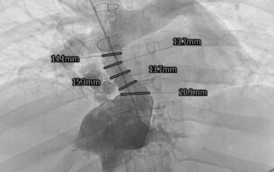 U pacjentki wszczepiony chirurgicznie konduit (przewód) doprowadzający krew z żyły głównej dolnej do łożyska płucnego uległ istotnemu zwężeniu. Kardiolodzy interwencyjni z dostępu przez żyłę główną górną (obie żyły udowe były niedrożne) poszerzyli ten konduit stentgraftem z bardzo dobrym efektem.